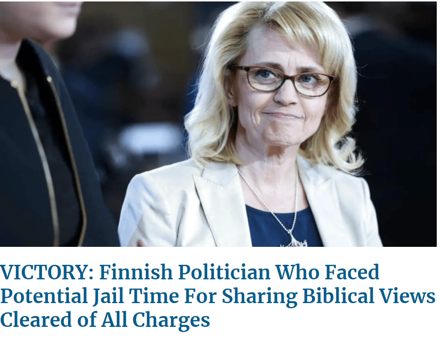 “Dr. Päivi Räsänen, a member of Finland’s parliament whose religious freedom plight made international headlines, expressed relief after the Helsinki Court of Appeal unanimously dismissed the three criminal charges against her.
