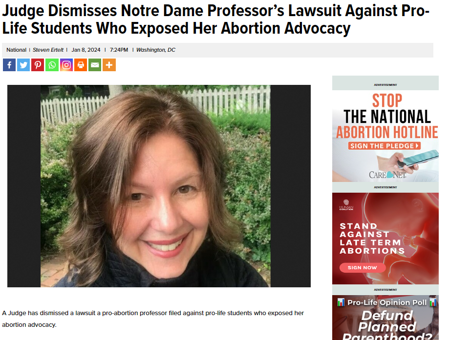 For full article: https://www.lifenews.com/2024/01/08/judge-dismisses-notre-dame-professors-lawsuit-against-pro-life-students-who-exposed-her-abortion-advocacy/