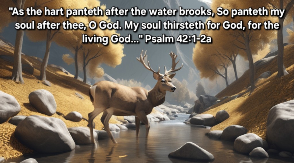 [1] As the hart panteth after the water brooks, So panteth my soul after thee, O God. [2] My soul thirsteth for God, for the living God: When shall I come and appear before God? [3] My tears have been my meat day and night, While they continually say unto me, Where is thy God? [4] When I remember these things, I pour out my soul in me: For I had gone with the multitude, I went with them to the house of God, With the voice of joy and praise, With a multitude that kept holyday. [5] Why art thou cast down, O my soul? And why art thou disquieted in me? Hope thou in God: For I shall yet praise him For the help of his countenance. [6] O my God, my soul is cast down within me: Therefore will I remember thee from the land of Jordan, and of the Hermonites, from the hill Mizar. [7] Deep calleth unto deep at the noise of thy waterspouts: All thy waves and thy billows are gone over me. [8] Yet the LORD will command his lovingkindness in the daytime, And in the night his song shall be with me, and my prayer unto the God of my life. [9] I will say unto God my rock, why hast thou forgotten me? Why go I mourning because of the oppression of the enemy? [10] As with a sword in my bones, Mine enemies reproach me; While they say daily unto me, Where is thy God? [11] Why art thou cast down, O my soul? And why art thou disquieted within me? Hope thou in God; For I shall yet praise him, who is the health of my countenance, and my God.”
