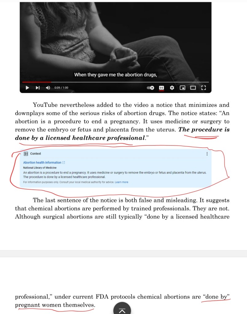 own misleading “information panel” to videos about abortion. Your notice contains false information about a central issue in a case pending before the U.S. Supreme Court. It also misleads women seeking information about abortion drugs, potentially endangering their lives. We demand that you remove or correct the notice immediately.