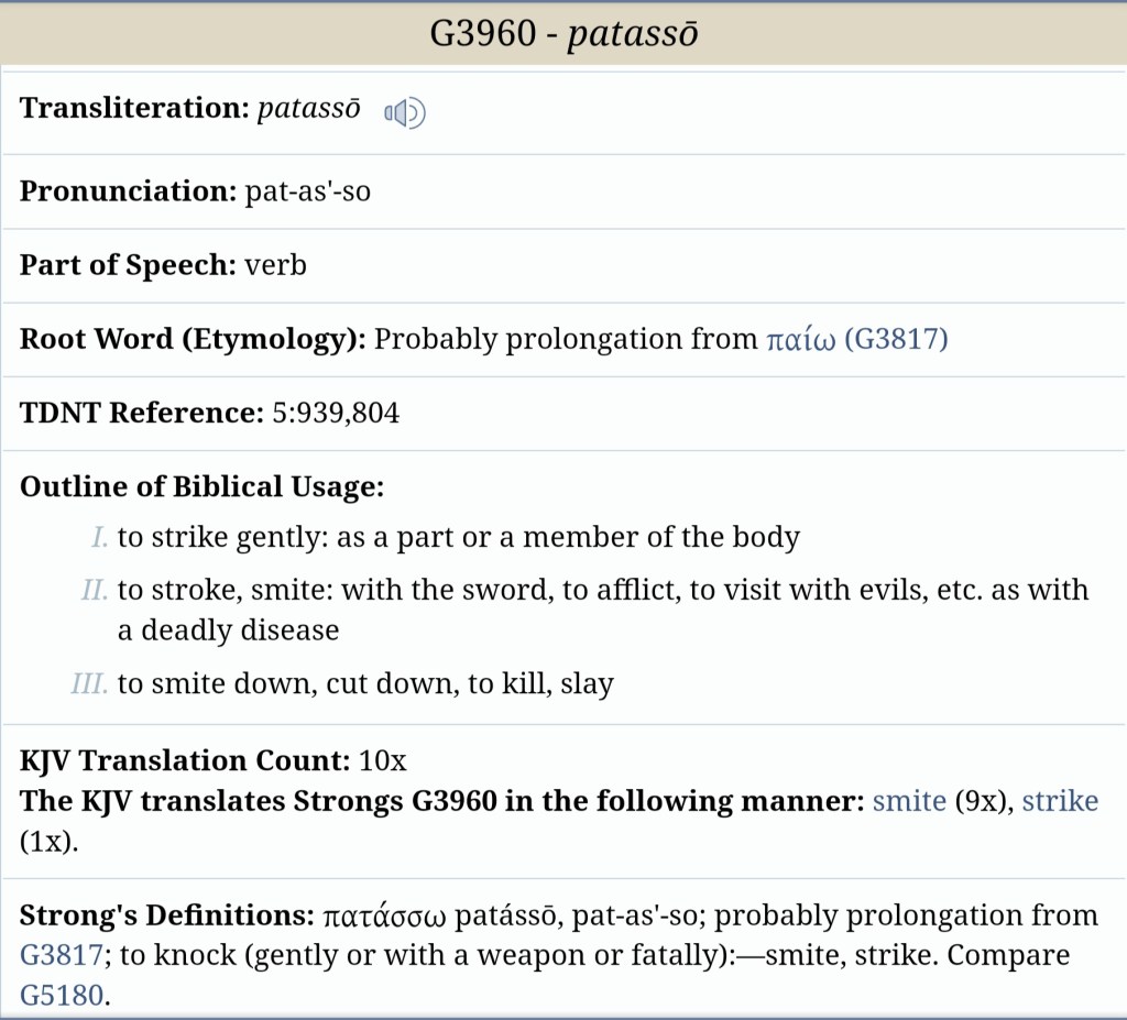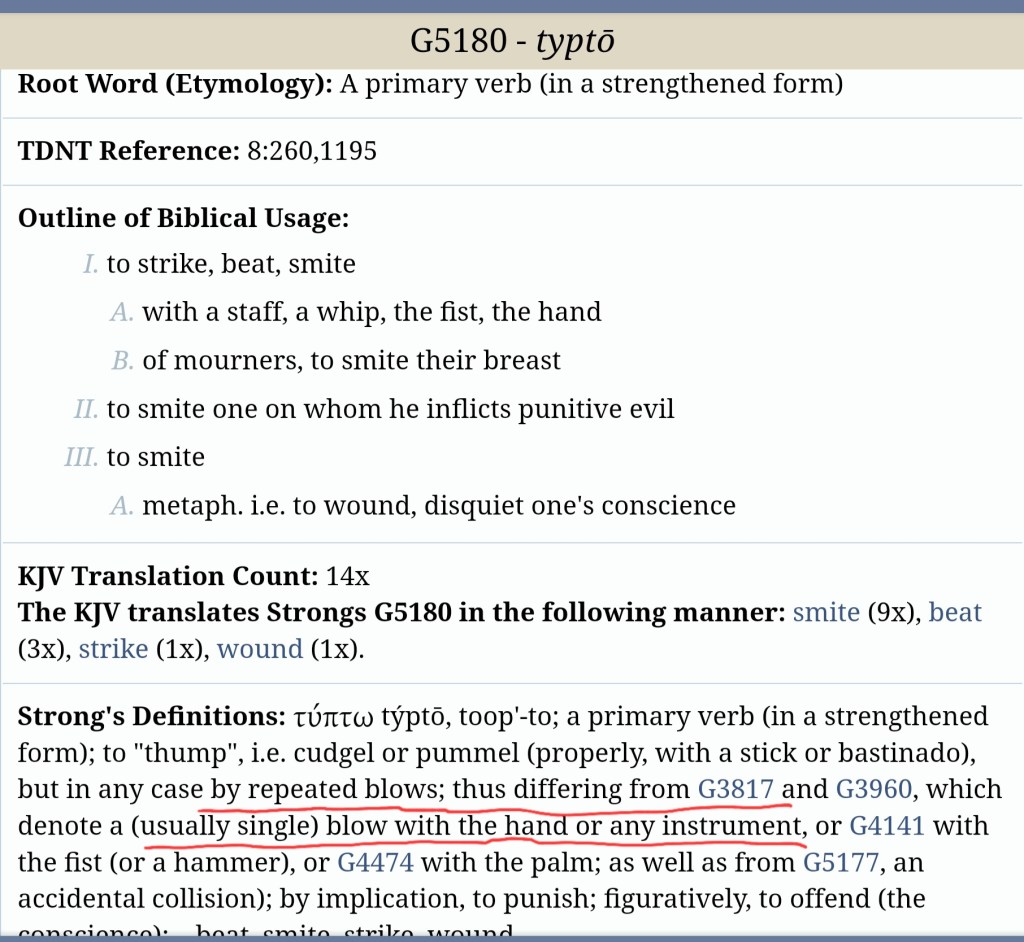 Update 5/17/2024: After reviewing the 14 times that “typto” is used in the NT it seems to be in context of an unjust beating/smiting except 3 times. 2 of those three people were smiting their own breasts, and one time, Paul calls on God to smite (unjustly smite “typto”) one after he was unjustly smitten by that one. And “patasso” is translated 10 times in the NT and you can see in all cases it is easily argued as a just smiting. Jesus is smitten of the Lord (justly for our sins as He is taking our just punishment) and then one cuts off an ear when Jesus is unjustly being taken as prisoner, and the rest are just smitings.