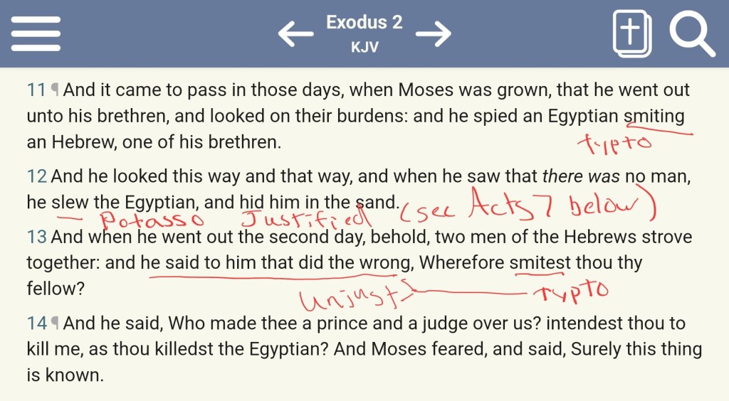The greek word for “beat” here is typto (Strongs G5180). This is clearly an unjust beating as Jesus says this servant will be judged for this in the next verse. Now, I find it interesting that the greek Septuagint doesn’t use typto (Strongs G5180) in Exodus 21:20 but rather patasso (Strongs G3960) but does use typto in Exodus 21:15 of a child smiting his father. So, the greek translators of the Old Testament used two different words for the smiting/beating in Exodus 21:15,21 even though they are the same Hebrew word. Which gives further evidence that even the Greek translators of the Septuagint (wikipedia dates back to 285 BC, many years before the Masoretic Hebrew text by a thousand years or so) translation of the Old Hebrew may agree with my position here and may give evidence that the original Hebrew may have distinguished between the two though I am no scholar and wish not to make that claim but seemingly possible. In spite of the two translations, it is clear that this understanding is further backed up by the greek even if the OG Hebrew didn’t distinguish between the two. I didn’t come to this conclusion by looking at the greek first but the hebrew and so even just looking at the hebrew and taking all in context gives you the same understanding. This is just further evidence as we look at another early translation into a different language of greek.