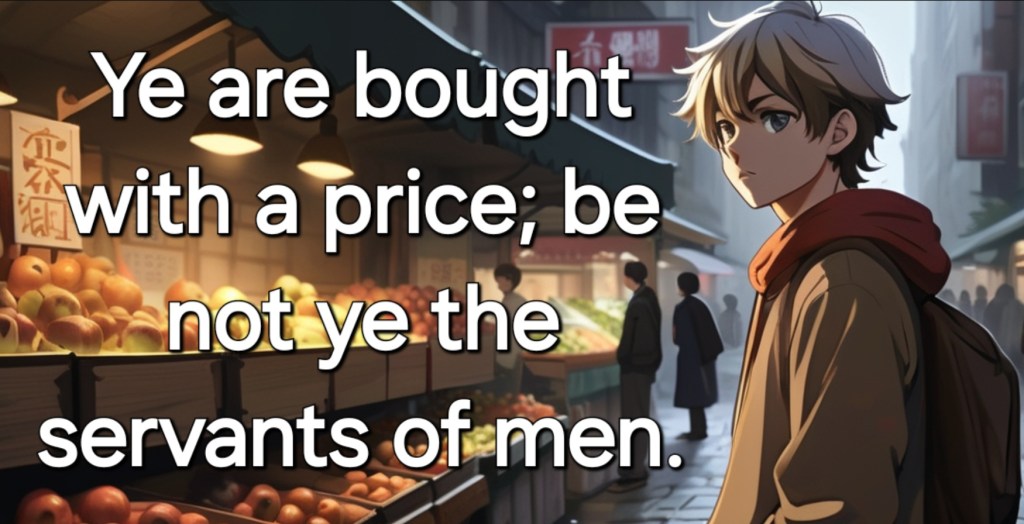 “[17] And if ye call on the Father, who without respect of persons judgeth according to every man’s work, pass the time of your sojourning here in fear: [18] forasmuch as ye know THAT YE WERE NOT REDEEMED WITH CORRUPTIBLE THINGS, as silver and gold, from your vain conversation received by tradition from your fathers; [19] BUT WITH THE PRECIOUS BLOOD OF CHRIST, as of a lamb without blemish and without spot: [20] who verily was foreordained before the foundation of the world, but was manifest in these last times for you, [21] who by him do believe in God, that raised him up from the dead, and gave him glory; that your faith and hope might be in God. [22] Seeing ye have purified your souls in obeying the truth through the Spirit unto unfeigned love of the brethren, see that ye love one another with a pure heart fervently: [23] being born again, not of corruptible seed, but of incorruptible, by the word of God, which liveth and abideth for ever. [24] For All flesh is as grass, And all the glory of man as the flower of grass. The grass withereth, and the flower thereof falleth away: [25] But the word of the Lord endureth for ever. And this is the word which by the gospel is preached unto you.” 1 Peter 1:17-25