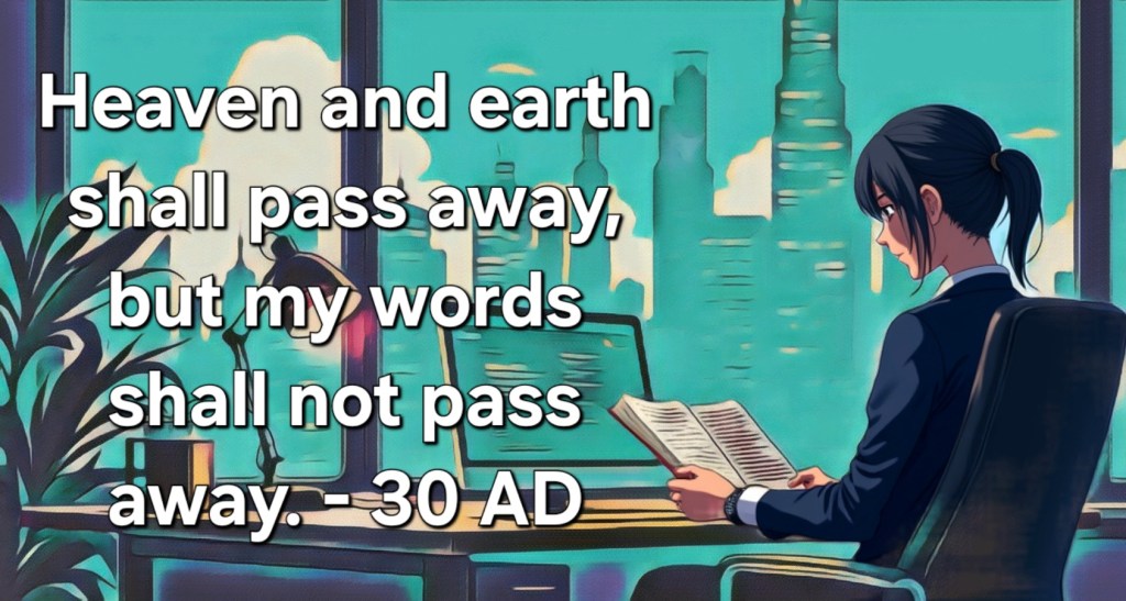 “Heaven and earth shall pass away, but my words shall not pass away.” – 30 AD Jesus as recorded in Matthew 25:35, Luke 21:32 and Mark 13:31