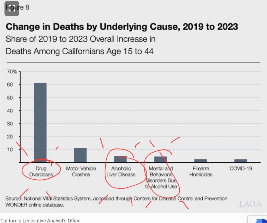 It appears about 70% of deaths are drug and alcohol related in Cali and mostly drug which is probably fentanyl.