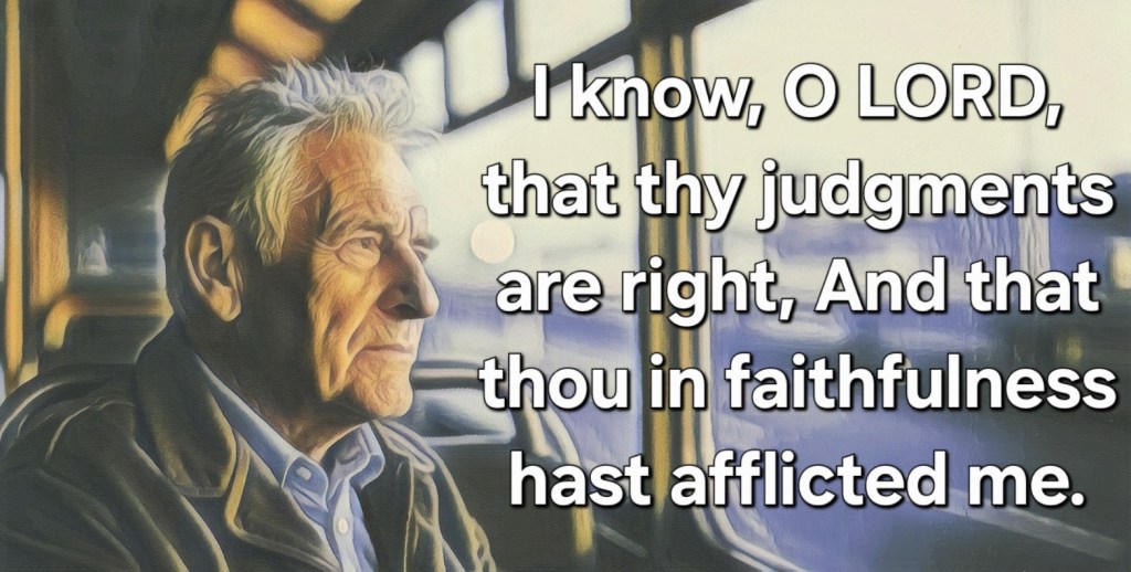 ‘Thy hands have made me and fashioned me: Give me understanding, that I may learn thy commandments. They that fear thee will be glad when they see me; Because I have hoped in thy word. I know, O LORD, that thy judgments are right, And that thou in faithfulness hast afflicted me. Let, I pray thee, thy merciful kindness be for my comfort, According to thy word unto thy servant. Let thy tender mercies come unto me, that I may live: For thy law is my delight. Let the proud be ashamed; for they dealt perversely with me without a cause: But I will meditate in thy precepts. Let those that fear thee turn unto me, And those that have known thy testimonies. Let my heart be sound in thy statutes; That I be not ashamed.” – Psalm 119:73-80