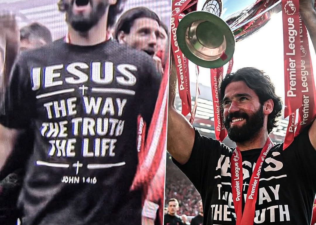 Liverpool Football Club goaltender Allison Becker, who is widely regarded as one of the best goaltenders of all time, celebrated his club’s recent championship run by lifting the Premier League trophy wearing a shirt with John 14:16 prominently emblazed across the front.