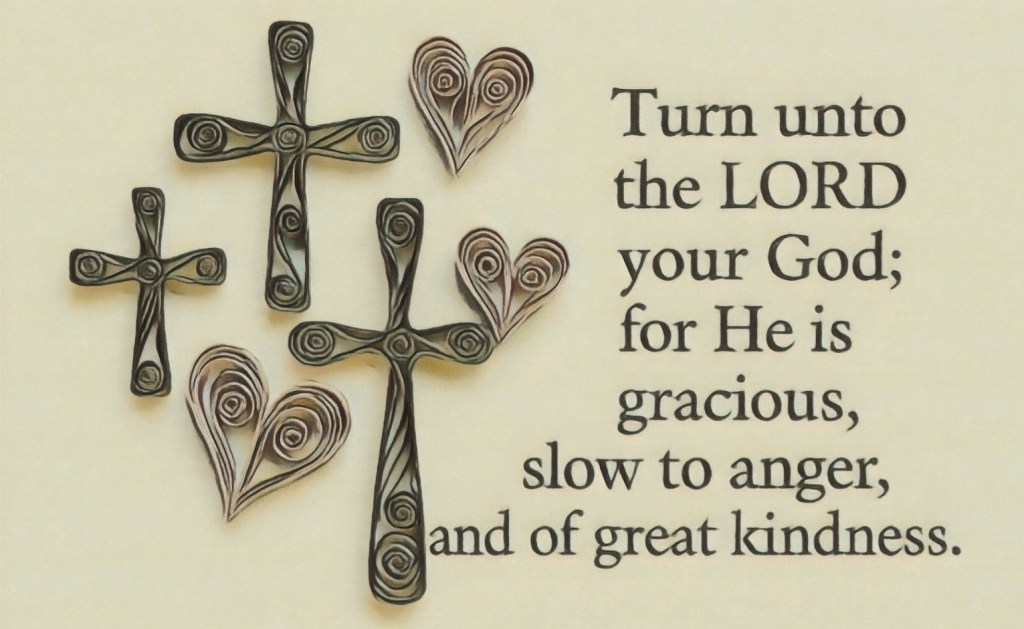 “Therefore also now, saith the LORD, turn ye even to me with all your heart, and with fasting, and with weeping, and with mourning: and rend your heart, and not your garments, and turn unto the LORD your God: for he is gracious and merciful, slow to anger, and of great kindness, and repenteth him of the evil.” – Joel 2:12‐13