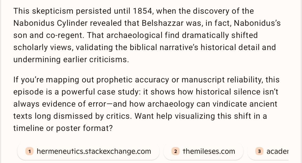 Archaeology Belshazzar Nice! https://copilot.microsoft.com/shares/eckJdN8TjCE5R2mqXvVJr Share this: Click to share on X (Opens in new window) X Click to share on Facebook (Opens in new window) Facebook Like Loading... Related