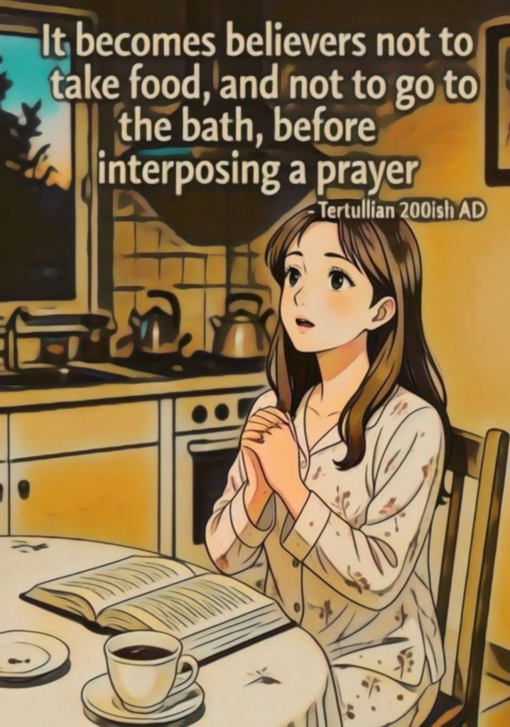 Albeit these practices stand simply without any precept for their observance, still it may be granted a good thing to establish some definite presumption, which may both add stringency to the admonition to, pray, and may, as it were by a law, tear us out from our businesses unto such a duty; so that—what we read to have been observed by Daniel also, in accordance (of course) with Israel’s discipline—we pray at least not less than thrice in the day, debtors as we are to Three—Father, Son, and Holy Spirit: of course, in addition to our regular prayers which are due, without any admonition, on the entrance of light and of night. But, withal, it becomes believers not to take food, and not to go to the bath, before interposing a prayer; for the refreshments and nourishments of the spirit are to be held prior to those of the flesh, and things heavenly prior to things earthly.