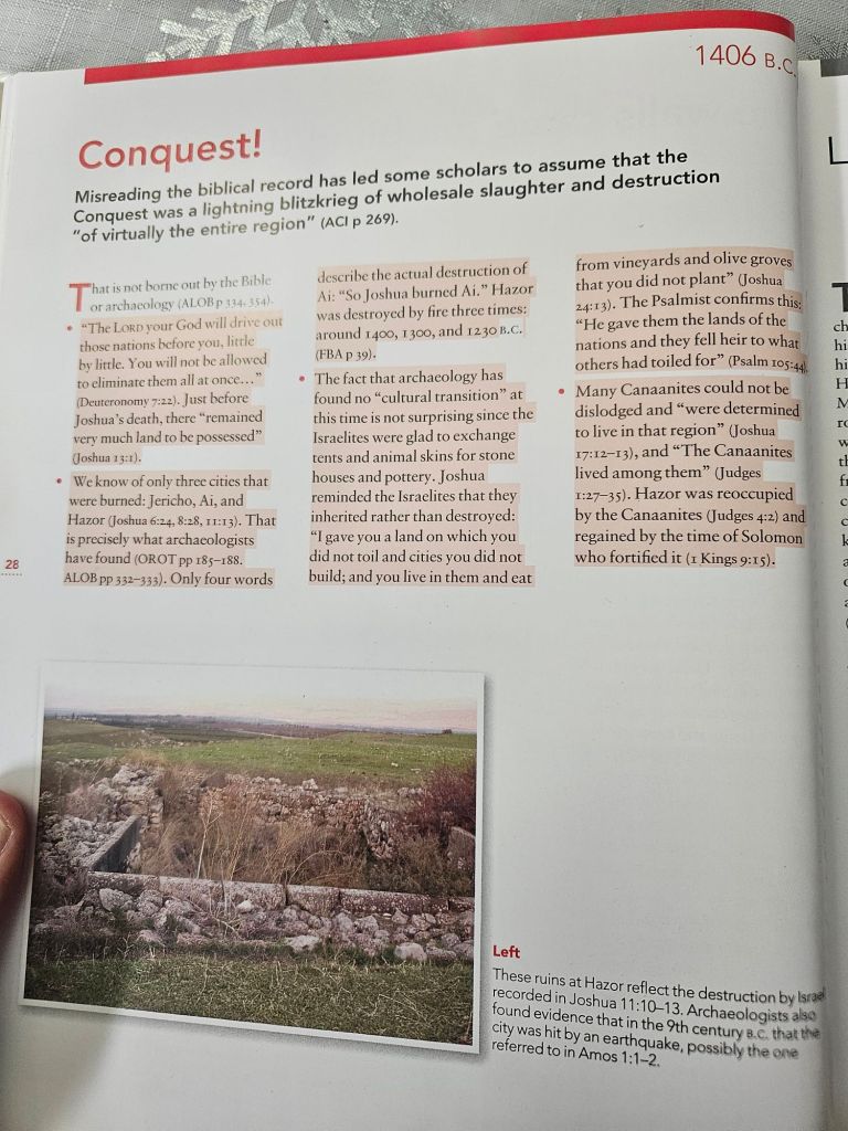 The conquest of Canaan by Israel described in the Scriptures and the Archaelogical evidence.