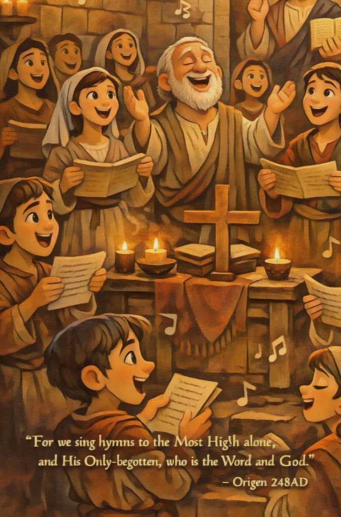For we sing hymns to the Most High alone, and His Only-begotten, who is the Word and God; and we praise God and His Only-begotten, as do also the sun, the moon, the stars, and all the host of heaven. For these all form a divine chorus, and unite with the just among men in celebrating the praises of the Most High God and His Only-begotten.